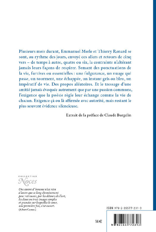 C’est plus facile de laisser filer le temps que de le réduire<br /> Plusieurs mois durant, Emmanuel Merle et Thierry Renard se sont, au rythme des jours, envoyé ces allers et retours de cinq vers – de temps à autre, quatre ou six, la contrainte n’altérant jamais leurs façons de respirer. Semant des ponctuations de la vie, furtives ou essentielles : une fulgurance, un nuage qui passe, un tourment, une échappée, un instant gris ou bleu, un impératif de vie. Des propos aléatoires. Et le tressage d’une amitié jamais évoquée autrement que par une passion commune, l’exigence que la poésie règle leur échange comme la vie de chacun. Exigence çà ou là affirmée avec autorité, mais restant le plus souvent évidence silencieuse. (Extrait de la préface)<br /> Préface de Claude Burgelin. Deux parties structurent le livre : La Chance d’un autre jour et Avant la vraie nuit.<br />