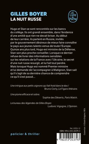 Hugo et Stan se sont rencontrés sur les bancs du collège. Ils ont grandi ensemble, dans l’évidence d’une amitié que rien ne devait briser. Au début de leur carrière, ils partent en Russie, invités par le gouvernement désireux de mieux faire connaître le pays aux jeunes talents venus de toute l’Europe. Quinze ans plus tard, Hugo est ministre de la Défense, Stan son plus proche conseiller. Lorsque ce dernier refuse de livrer des informations sensibles sur les relations de la France avec l’Ukraine, le secret d’une nuit russe resurgit, et lui fait tout perdre. Mais lorsque Hugo est nommé Premier ministre et lui demande de l’accompagner à Matignon, Stan sait qu’il s’agit de sa dernière chance de comprendre ce qu’il s’est passé...