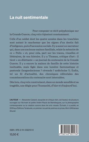 Pour composer ce récit polyphonique sur la Grande Guerre, cinq voix s'ajustent constamment. Celle d'un soldat dont les quatre années dans les tranchées sont autant le cauchemar que les signes d'un destin fait d'indigence, puis d'ascension sociale. Il y a aussi un narrateur qui, dans une ancienne maison familiale, relaie la mémoire de ce « Poilu » et, pour cela, part sur les traces, visuelles et littéraires, de son histoire. Il y a Thomas, critique d'art : il tient « en dilettante » un journal du centenaire de la Grande Guerre. Il y a encore la maison de famille de cette histoire insituable, mais figée dans une lumière fantomatique et pastorale (languedocienne ? cévenole ? ardéchoise ?). Enfin, tel un fil d'actualité, des chroniques éditoriales des commémorations du centenaire sont intercalées. Dès lors, cinq voix construisent, dans un monde sensible et sa tragédie, une élégie pour l'humanité, d'hier et d'aujourd'hui.
