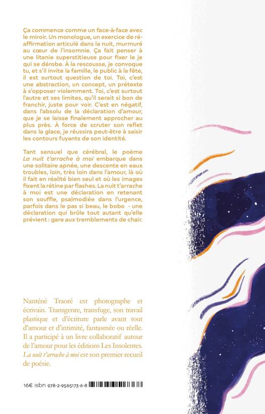 Ça commence comme un face-à-face avec le miroir. Un monologue, un exercice de réaffirmation articulé dans la nuit, murmuré au coeur de l'insomnie. Ça fait penser à une litanie superstitieuse pour fixer le je qui se dérobe. À la rescousse, je convoque tu, et s'il invite la famille, le public à la fête, il est surtout question de toi. Toi, c'est une abstraction, un concept, un prétexte à s'opposer violemment. Toi, c'est surtout l'autre et ses limites, qu'il serait si bon de franchir, juste pour voir. C'est en négatif, dans l'absolu de la déclaration d'amour, que je se laisse finalement approcher au plus près. À force de scruter son reflet dans la glace, je réussira peut-être à saisir les contours fuyants de son identité. Tant sensuel que cérébral, le poème La nuit t'arrache à moi embarque dans une solitaire apnée, une descente en eaux troubles, loin très loin dans l'amour, là où il fait en réalité bien seul et où les images fixent la rétine par flashes. La nuit t'arrache à moi est une