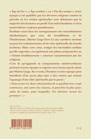 Edition revue et augmentée. « Âge de Fer », « Âge sombre » ou « Fin des temps », notre époque a été qualifiée par les diverses religions comme la période où les vérités spirituelles sont délaissées par la majorité des hommes au profit d’un individualisme et d’un matérialisme toujours grandissants. Etudiant aussi bien les enseignements des monothéismes abrahamiques que ceux du bouddhisme et de l’hindouisme, Martin Lings livre ici une synthèse mettant au jour les soubassements de la crise spirituelle du monde moderne. Mais cette crise, malgré les inévitables méfaits qu’elle engendre, est également une phase préparatoire au « Grand rétablissement » annoncé unanimement par les religions. C’est là qu’apparaît la compensation miséricordieuse présente à notre époque et qu’expose avec beaucoup de clarté Martin Lings. En ce sens, les derniers hommes peuvent bénéficier d’un accès plus aisé à des vérités qui étaient l’apanage d’une élite spirituelle par le passé : « Nous avons ici, dans cette jonction de ce qui finit avec ce qui commence, une autre des raisons, et peut-être la plus puissante de toutes, pour lesquelles ‘‘les derniers seront les premiers’’ »