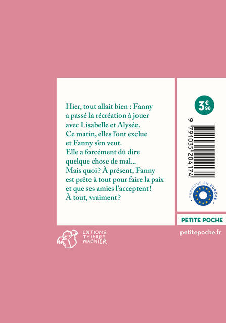 Hier, tout allait bien : Fanny a passé la récréation à jouer avec Lisabelle et Alysée. Ce matin, elles l'ont exclue et Fanny s'en veut. Elle a forcément dû dire quelque chose de mal... Mais quoi ? À présent, Fanny est prête à tout pour faire la paix et que ses amies l'acceptent ! À tout, vraiment ?