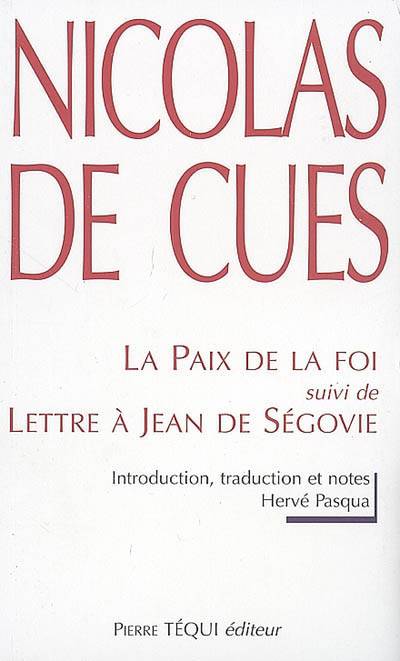 À l'heure où Nicolas de Cues écrit le « De pace fidei » en 1453, Constantinople tombe aux mains des Ottomans. L'Europe chrétienne, en émoi, s'apprête pour se défendre à prendre les armes. Le cardinal de Cues, conscient que la charité doit commander l'entente entre Chrétiens et Musulmans, travaille alors à une réconciliation par-delà toute solution exclusivement politique, c'est-à-dire armée. Dans sa Lettre à Jean de Ségovie, traduite en annexe, il exprime sa confiance : « Si nous procédons selon la doctrine du Christ, nous ne nous tromperons pas, mais son Esprit parlera par notre bouche et aucun adversaire du Christ ne pourra lui résister ; mais si nous choisissons d'attaquer par une invasion en armes, nous devons craindre en usant de l'épée, de périr par l'épée. » Dans ces lignes, Nicolas révèle l'intention qui l'anime. Homme de paix, il préfère « dialoguer plutôt que guerroyer », sûr que la religion unit les hommes parce que Dieu est unique. La paix de la foi, traduite et présentée par Hervé Pasqua, se situe dans la lignée des « Dialogues entre un philosophe, un juif et un païen » d'Abélard et du « Livre du gentil et des trois païens » de Raymond Lulle. Elle inspirera Pic de la Mirandole et Marsile Ficin et annonce le « Projet de paix perpétuelle » de Kant. Cette oeuvre magistrale s'inscrit dans le cadre du dialogue entre les religions et particulièrement, entre le Christianisme et l'Islam.