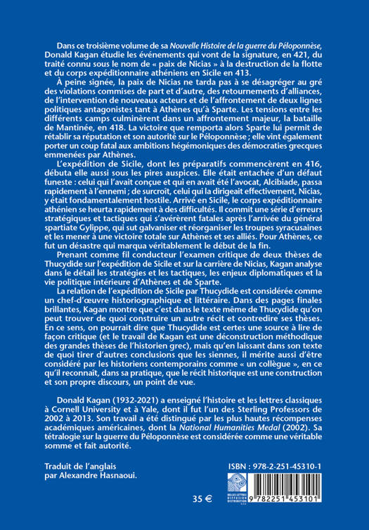 Dans ce troisieme volume de sa Nouvelle Histoire de la guerre du Peloponnese, Donald Kagan etudie les evenements qui vont de la signature, en 421, du traite connu sous le nom de paix de Nicias a la destruction de la flotte et du corps expeditionnaire atheniens en Sicile en 413. A peine signee, la paix de Nicias ne tarda pas a se desagreger au gre des violations commises de part et d'autre, des retournements d'alliances, de l'intervention de nouveaux acteurs et de l'affrontement de deux lignes politiques antagonistes tant a Athenes qu'a Sparte. Les tensions entre les differents camps culminerent dans un affrontement majeur, la bataille de Mantinee, en 418. La victoire que remporta alors Sparte lui permit de retablir sa reputation et son autorite sur le Peloponnese; elle vint egalement porter un coup fatal aux ambitions hegemoniques des democraties grecques emmenees par Athenes. L'expedition de Sicile, dont les preparatifs commencerent en 416, debuta elle aussi sous les pires auspices. Elle etait entachee d'un defaut funeste: celui qui l'avait concue et qui en avait ete l'avocat, Alcibiade, passa rapidement a l'ennemi; de surcroit, celui qui la dirigeait effectivement, Nicias, y etait fondamentalement hostile. Arrive en Sicile, le corps expeditionnaire athenien se heurta rapidement a des difficultes. Il commit une serie d'erreurs strategiques et tactiques qui s'avererent fatales apres l'arrivee du general spartiate Gylippe, qui sut galvaniser et reorganiser les troupes syracusaines et les mener a une victoire totale sur Athenes et ses allies. Pour Athenes, ce fut un desastre qui marqua veritablement le debut de la fin. Prenant comme fil conducteur l'examen critique de deux theses de Thucydide sur l'expedition de Sicile et sur la carriere de Nicias, Kagan analyse dans le detail les strategies et les tactiques, les enjeux diplomatiques et la vie politique interieure d'Athenes et de Sparte. La relation de l'expedition de Sicile par Thucydide est consideree comme un chef-d'oeuvre historiographique et litteraire. Dans des pages finales brillantes, Kagan montre que c'est dans le texte meme de Thucydide qu'on peut trouver de quoi construire un autre recit et contredire ses theses. En ce sens, on pourrait dire que Thucydide est certes une source a lire de facon critique (et le travail de Kagan est une deconstruction methodique des grandes theses de l'historien grec), mais qu'en laissant dans son texte de quoi tirer d'autres conclusions que les siennes, il merite aussi d'etre considere par les historiens contemporains comme un collegue, en ce qu'il reconnait, dans sa pratique, que le recit historique est une construction et son propre discours, un point de vue.