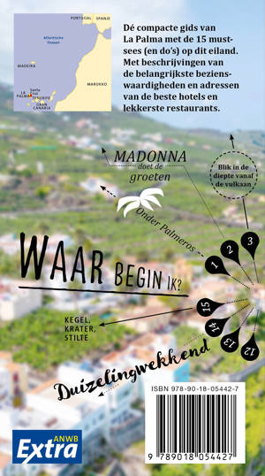 ANWB Extra reisgids La Palma Spanje Beleef La Palma met de compleet vernieuwde reisgids ANWB Extra La Palma. Sappige groene weiden met goed doorvoede koeien tegen een decor van beboste hellingen. Dit zijn niet de Alpen, maar het is een eiland in de Atlantische Oceaan, La Palma! De ANWB Extra reisgids La Palma biedt naast veel praktische tips over campings, vakantiehuizen, hotels en vervoer ook 15 inspirerende bezienswaardigheden die je niet mag missen.