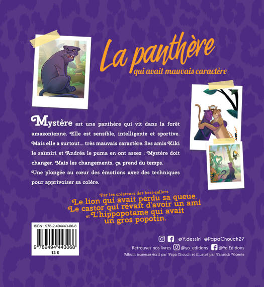 Mystère est une panthère qui vit dans la forêt amazonienne. Mystère est sensible, intelligente et sportive. Mais elle a surtout... très mauvais caractère. Ses amis Kiki le saïmiri et Andréa le puma en ont assez : Mystère doit changer. Mais les changements, ça prend du temps. Une plongée au cœur des émotions avec des techniques pour apprivoiser sa colère. Une héroïne à laquelle on s'identifie : elle évolue et apprend à reconnaître ses erreurs. Cet ouvrage a été relu par une psychologue. Après le succès de la trilogie de la savane aux 90 000 exemplaires vendus (« Le lion qui avait perdu sa queue », « Le castor qui rêvait d'avoir un ami », « L'hippopotame qui avait un gros popotin »), le duo Papa Chouch-Yannick Vicente est de retour avec un tout nouvel univers de héros attachants.