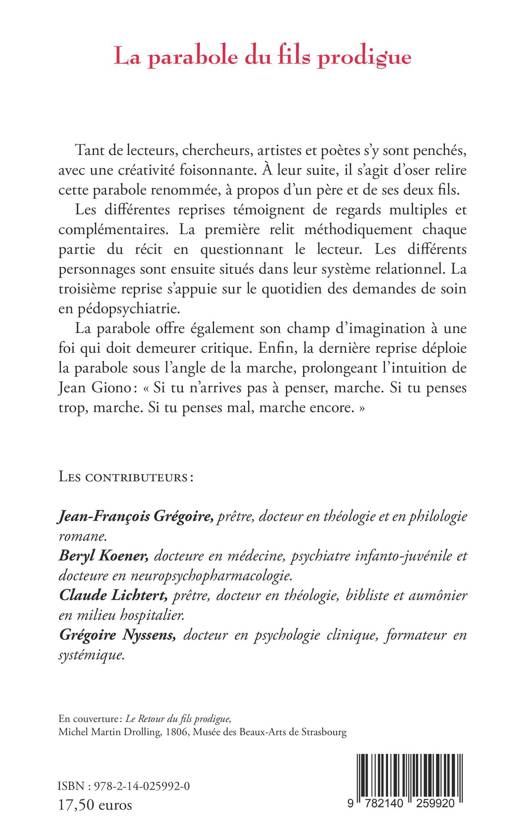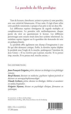 Tant de lecteurs, chercheurs, artistes et poètes s'y sont penchés, avec une créativité foisonnante. À leur suite, il s'agit d'oser relire cette parabole renommée, à propos d'un père et de ses deux fils. Les différentes reprises témoignent de regards multiples et complémentaires. La première relit méthodiquement chaque partie du récit en questionnant le lecteur. Les différents personnages sont ensuite situés dans leur système relationnel. La troisième reprise s'appuie sur le quotidien des demandes de soin en pédopsychiatrie. La parabole offre également son champ d'imagination à une foi qui doit demeurer critique. Enfin, la dernière reprise déploie la parabole sous l'angle de la marche, prolongeant l'intuition de Jean Giono : « Si tu n'arrives pas à penser, marche. Si tu penses trop, marche. Si tu penses mal, marche encore. »