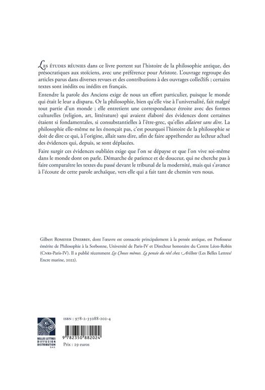 Les études réunies dans ce livre portent sut l’histoire de la philosophie antique, des présocratiques aux stoïciens, avec une préférence pour Aristote. L’ouvrage regroupe des articles parus dans diverses revues et des contributions à des ouvrages collectifs ; certains textes sont inédits ou inédits en français.