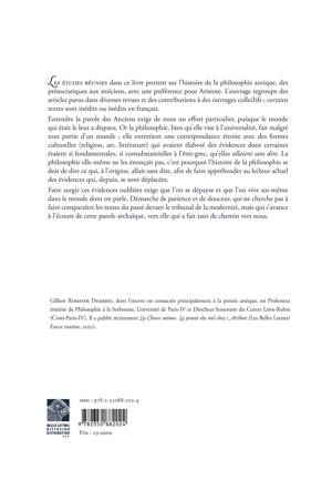 Entendre la parole des Anciens exige de nous un effort particulier, puisque le monde qui était le leur a disparu. Or la philosophie, bien qu’elle vise à l’universalité, fait malgré tout partie d’un monde ; elle entretient une correspondance étroite avec des formes culturelles (religion, art, littérature) qui avaient élaboré des évidences dont certaines étaient si fondamentales, si consubstantielles à l’être-grec, qu’elles allaient sans dire. La philosophie elle-même ne les énonçait pas, c’est pourquoi l’histoire de la philosophie se doit de dire ce qui, à l’origine, allait sans dire, afin de faire appréhender au lecteur actuel des évidences qui, depuis, se sont déplacées.