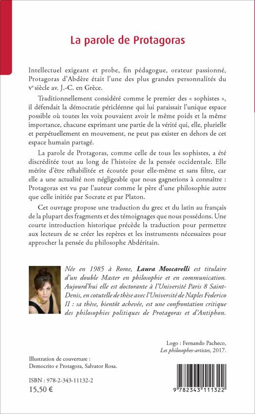 Intellectuel intelligent et probe, fin pédagogue, orateur passionné, Protagoras d'Abdère était l'une des plus grandes personnalités de la Grèce antique. Traditionnellement considéré comme le premier des "sophistes", il défendait la démocratie péricléenne. Sa parole, comme celle de tous les sophistes, a été discréditée tout au long de l'histoire de la pensée occidentale. Elle mérite d'être réhabilitée et écoutée pour elle-même. Cet ouvrage propose donc une traduction du grec et du latin au français de la plupart des fragments et des témoignages que nous possédons. Une courte introduction historique précède ces textes.
