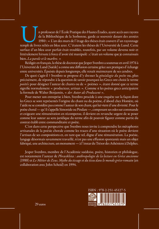 Un professeur de l'Ecole Pratique des Hautes Etudes, ayant acces aux rayons de la Bibliotheque de la Sorbonne, garde ce souvenir datant des annees 1980: L'un des murs de l'etage des theses etait couvert d'un rayonnage rempli de livres relies en bleu azur. C'etaient les theses de l'Universite de Lund. Cette surface d'un bleu azur parfait etait troublee, toutefois, par un volume devenu noir et litteralement hirsute a force d'avoir ete manipule: c'etait un volume que je connaissais bien, La parole et le marbre. Redigee en francais, la these de doctorat que Jesper Svenbro a soutenue en avril 1976 a l'Universite de Lund (Suede) a connu une diffusion certaine grace aux pratiques d'echange entre universites. Epuisee depuis longtemps, elle renait maintenant de ses cendres.De quoi s'agit-il ? Svenbro se propose d'y dresser la genealogie du poete ou, plus precisement, de repondre a la question de savoir pourquoi les Grecs ont choisi le terme poietes pour designer l'auteur de chants ou de poemes , etant donne que ce terme signifie normalement producteur, artisan . Comme si les poetes grecs anticipaient la formule de Walter Benjamin, der Autor als Produzent.Pour mener son entreprise a bien, Svenbro procede a une enquete sur la facon dont les Grecs se sont representes l'origine du chant ou du poeme, d'abord chez Homere, ou l'aede ne se considere pas comme l'auteur de son chant, qui lui vient d'une divinite. Pour le poete choral - qu'il s'appelle Simonide ou Pindare -, composant ses odes sur commande et exigeant une remuneration en recompense, il devient en revanche urgent de se poser comme leur auteur au sens juridique du terme afin de pouvoir figurer comme partie du contrat etabli entre commanditaire et poete.C'est dans cette perspective que Svenbro nous invite a comprendre les metaphores artisanales de la poesie chorale comme les traces d'une situation ou le poete devient l'artisan de ses compositions et, en tant que tel, digne d'une remuneration. La poesie, langage desormais savamment travaille, n'est pas une effusion spontanee mais un objet fabrique, une architecture, un monument - a l'instar du Tresor des Atheniens a Delphes.