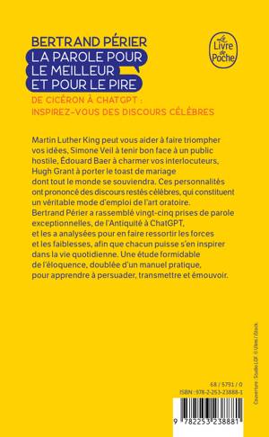 Ces personnalités ont prononcé des discours restés célèbres, qui constituent un véritable mode d’emploi de l’art oratoire. Bertrand Périer a rassemblé vingt-cinq prises de parole exceptionnelles, de l’Antiquité à ChatGPT, et les a analysées pour en faire ressortir les forces et les faiblesses, afin que chacun puisse s’en inspirer dans la vie quotidienne.