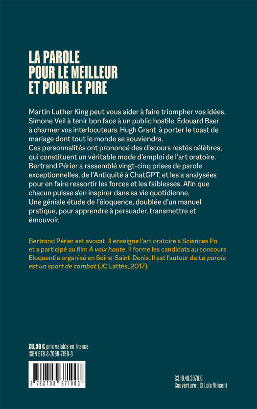Ces personnalités ont prononcé des discours restés célèbres, qui constituent un véritable mode d’emploi de l’art oratoire. Bertrand Périer a rassemblé vingt-cinq prises de parole exceptionnelles, de l’Antiquité à ChatGPT, et les a analysées pour en faire ressortir les forces et les faiblesses. Afin que chacun puisse s’en inspirer dans sa vie quotidienne.