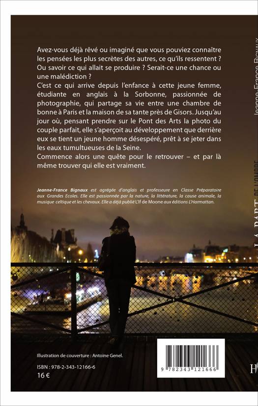 Avez-vous déjà rêvé ou imaginé que vous pouviez connaître les pensées les plus secrètes des autres, ce qu'ils ressentent ? C'est ce qui arrive depuis l'enfance à cette jeune femme, étudiante en anglais à la Sorbonne et passionnée de photographie. Jusqu'au jour où, pensant prendre sur le Pont des Arts la photo du couple parfait, elle s'aperçoit au développement que derrière eux se tient un jeune homme désespéré, prêt à se jeter dans les eaux tumultueuses de la Seine. Comme alors une quête pour le retrouver, et par là même trouver qui elle est vraiment.