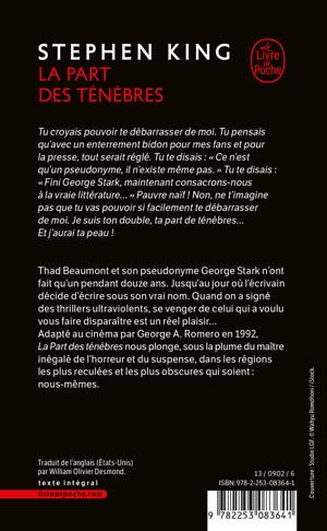 Adapté au cinéma par George A. Romero en 1992, La Part des ténèbres nous plonge, sous la plume du maître inégalé de l’horreur et du suspense, dans les régions les plus reculées et les plus obscures qui soient : au fond de nous-mêmes.