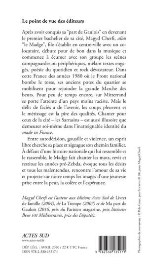 Après avoir conquis sa "part de Gaulois" en devenant le premier bachelier de sa cité, Magyd Cherfi , alias "le Madge", fi le s'établir en centre-ville avec un colocataire, débute pour de bon dans la musique et commence à écu mer avec son groupe les scènes campagnardes ou périphériques, mêlant textes engagés, poésie du quotidien et rock dévastateur. Dans cette France des années 1980 où le Front national bombe le torse, ses anciens potes du quartier se mobilisent pour rejoindre la grande Marche des beurs. Pour peu de temps encore, sur Mitterrand se porte l'attente d'un pays moins raciste. Mais le délit de faciès a de l'avenir, les coups pleuvent et le métissage est la pire des qualités. Chanter pour ceux de la cité - les Sarrasins - est aussi illusoire que demeurer soi-même dans l'inatteignable identité du «made in France.»