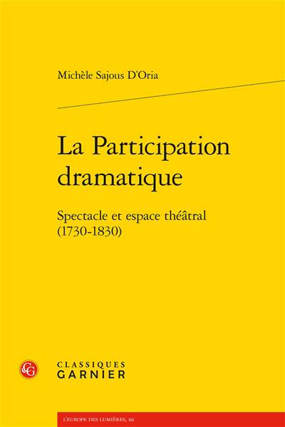 Dans la perspective d'une histoire du théâtre inséparable des pratiques et des usages sociaux et politiques, la périodisation (1730-1830) renvoie à des dates d'ordre dramaturgique et politique. Elle se place sous le signe d'une exigence de liberté et d'égalité qui s'exprime dans une conception de la salle correspondant idéalement à la fonction civique du spectacle et, sur la scène, dans la contamination des genres. La participation dramatique, ainsi redéfinie, englobe la multiplication des salles, l'architecture, la décoration, le public (exclusion et inclusion du peuple). Du côté de la scène, elle concerne les acteurs, le décor et les costumes, la dimension visuelle du spectacle, la lutte contre les règles et l'émergence de nouveaux genres.