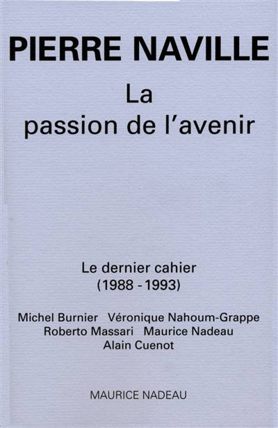 Notre société se débat aujourd’hui dans une situation de crise qui engendre le pessimisme. Cette situation invite à se poser des questions de fond : quelles valeurs opposer à la marchandisation du monde ? Que peut la littérature ? La recherche scientifique ? La politique ? Comment se débarasser des mensonges dominants ? Comment refonder le socialisme ? À ces questions, Pierre Naville est un rare esprit à avoir su donner des réponses. Michel Burnier, Véronique Nahoum-Grappe, Robert Massari, Maurice Nadeau l’accompagnent de textes montrant l’usage qui peut en être fait. Alain Cuenot dresse une chronologie de la vie et des oeuvres de Pierre Naville. 230 p. 20 euros (2010)