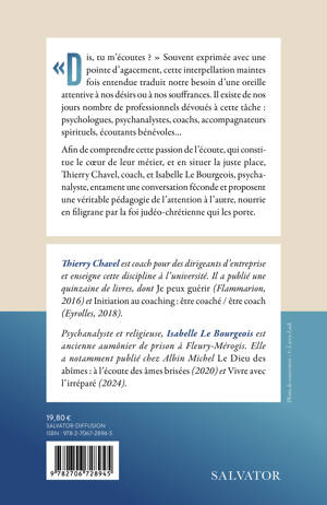 « Dis, tu m'écoutes ? » Souvent exprimée avec une pointe d'agacement, cette interpellation maintes fois entendue traduit notre besoin d'une oreille attentive à nos désirs ou à nos souffrances. Il existe de nos jours nombre de professionnels dévoués à cette tâche : psychologues, psychanalystes, coachs, accompagnateurs spirituels, écoutants bénévoles⦠Afin de comprendre cette passion de l'écoute, qui constitue le cÅur de leur métier, et en situer la juste place, Thierry Chavel, coach, et Isabelle Le Bourgeois, psychanalyste, entament une conversation féconde et proposent une véritable pédagogie de l'attention à l'autre, nourrie en filigrane par la foi judéo-chrétienne qui les porte.