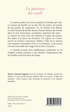 La maison parle à mi-voix en poésie et l'entende qui veut. La maison de famille est un lieu fait de matins, de travail, de pas perdus, de respirations. Ici, les absents sont debout. La mort du père de famille dessine d'autres formes, des retraits dans la nuit, d'anciennes circulations cherchent des mots... La maison est aussi récit, des histoires à la place des choses, des objets à la place des histoires. Un espace où s'isoler, ouvrir les fenêtres autrement. Habiter l'idée de la maison c'est inquiéter doucement l'être et ses fantômes. C'est encore l'écoute renouvelée des visages d'une mère, d'un père. La lumière brutale d'un établissement médicalisé ou de l'hôpital conduit surement à une clairière d'impressions faite de troubles et de rêves hors du temps.