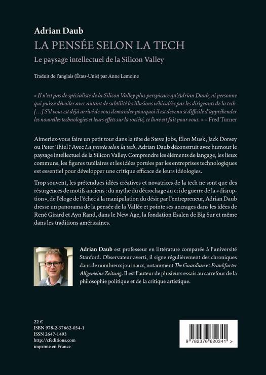 Aimeriez-vous faire un petit tour dans la tête de Steve Jobs, Elon Musk, Jack Dorsey ou Peter Thiel ? Avec La pensée selon la tech, Adrian Daub déconstruit avec humour le paysage intellectuel de la Silicon Valley. Comprendre les éléments de langage, les lieux communs, les figures tutélaires et les idées portées par les entreprises technologiques est essentiel pour développer une critique efficace de leurs idéologies.