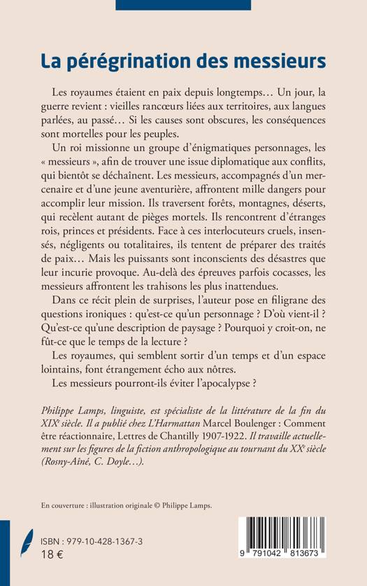 Les royaumes étaient en paix depuis longtemps... Un jour, la guerre revient: vieilles rancoeurs liées aux territoires, aux langues parlées, au passé... Si les causes sont obscures, les conséquences sont mortelles pour les peuples. Un roi missionne un groupe d'énigmatiques personnages, les messieurs, afin de trouver une issue diplomatique aux conflits, qui bientôt se déchaînent. Les messieurs, accompagnés d'un mercenaire et d'une jeune aventurière, affrontent mille dangers pour accomplir leur mission. Ils traversent forêts, montagnes, déserts, qui recèlent autant de pièges mortels. Ils rencontrent d'étranges rois, princes et présidents. Face à ces interlocuteurs cruels, insensés, négligents ou totalitaires, ils tentent de préparer des traités de paix... Mais les puissants sont inconscients des désastres que leur incurie provoque. Au-delà des épreuves parfois cocasses, les messieurs affrontent les trahisons les plus inattendues. Dans ce récit plein de surprises, l'auteur pose en filigrane des questions ironiques: qu'est-ce qu'un personnage ? D'où vient-il ? Qu'est-ce qu'une description de paysage ? Pourquoi y croit-on, ne fût-ce que le temps de la lecture ? Les royaumes, qui semblent sortir d'un temps et d'un espace lointains, font étrangement écho aux nôtres. Les messieurs pourront-ils éviter l'apocalypse ?