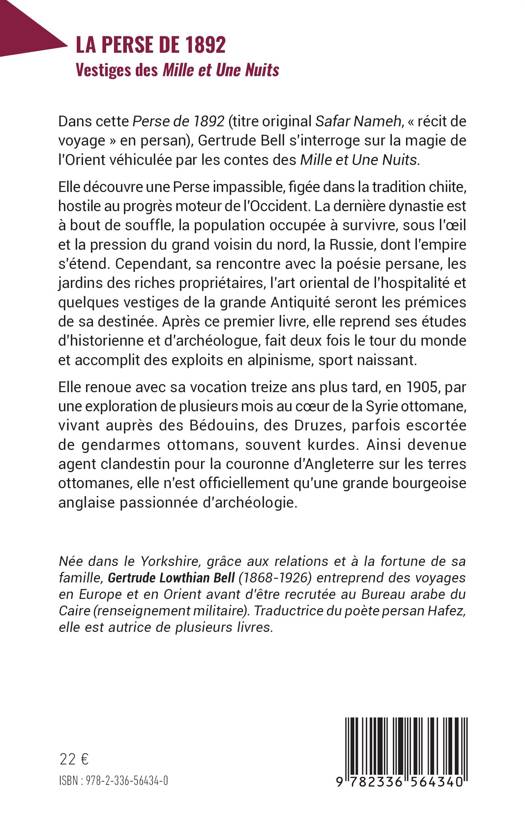 Dans cette Perse de 1892 (titre original Safar Nameh, récit de voyage en persan), Gertrude Bell s'interroge sur la magie de l'Orient véhiculée par les contes des Mille et Une Nuits. Elle découvre une Perse impassible, figée dans la tradition chiite, hostile au progrès moteur de l'Occident. La dernière dynastie est à bout de souffle, la population occupée à survivre, sous l'oeil et la pression du grand voisin du nord, la Russie, dont l'empire s'étend. Cependant, sa rencontre avec la poésie persane, les jardins des riches propriétaires, l'art oriental de l'hospitalité et quelques vestiges de la grande Antiquité seront les prémices de sa destinée. Après ce premier livre, elle reprend ses études d'historienne et d'archéologue, fait deux fois le tour du monde et accomplit des exploits en alpinisme, sport naissant. Elle renoue avec sa vocation treize ans plus tard, en 1905, par une exploration de plusieurs mois au coeur de la Syrie ottomane, vivant auprès des Bédouins, des Druzes, parfois escortée de gendarmes ottomans, souvent kurdes. Ainsi devenue agent clandestin pour la couronne d'Angleterre sur les terres ottomanes, elle n'est officiellement qu'une grande bourgeoise anglaise passionnée d'archéologie.