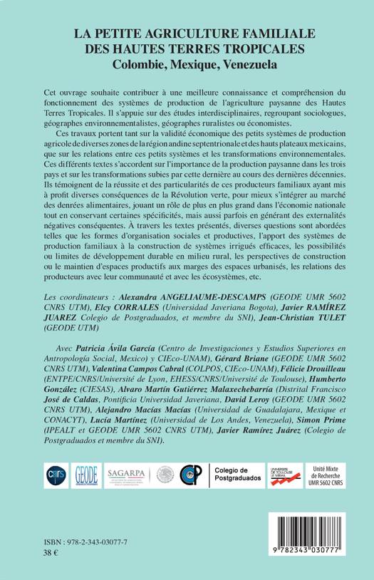 Ces travaux portent tant sur la validité économique des petits systèmes de production agricole de diverses zones de la région andine septentrionale et des hauts plateaux mexicains, que sur les relations entre ces petits systèmes et les transformations environnementales. Diverses questions sont abordées telles que les formes d'organisation sociales et productives, l'apport des systèmes de production familiaux à la construction de systèmes irrigués efficaces, les possibilités ou les limites de développement durable en milieu rural.