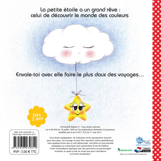 La petite étoile a un grand rêve : celui de découvrir le monde des couleurs ! Envole-toi avec elle faire le plus doux des voyages… Cet album, destiné aux 3-4 ans, propose l’apprentissage des couleurs, tout en accompagnant une petite étoile dans un voyage à la poursuite de son rêve. La poésie du texte et la douceur des illustrations invitent les enfants à partager un grand moment de tendresse. Les thèmes abordés sont les rêves, les couleurs, la nature ainsi qu’une sensibilisation à la différence.