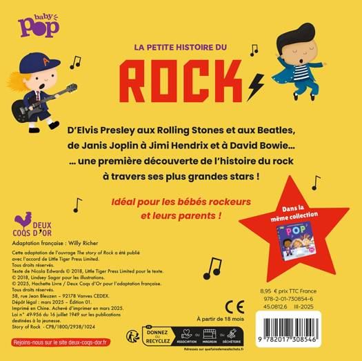 D'Elvis Presley aux Rolling Stones et aux Beatles, de Janis Joplin à Jimi Hendrix et à David Bowie... une première découverte de l'histoire du rock à travers ses plus grandes stars ! Idéal pour les bébés rockeurs et leurs parents !