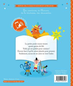 La petite poule rousse trouve quatre grains de blé. Voilà qui est parfait pour cuisiner ! Encore faut-il qu'ils soient plantés pour pousser. Seulement, aucun de ses amis ne veut l'aider. Le célèbre conte sur le thème de l'entraide et de la solidarité revisité avec humour, avec un jeu visuel sur une double page et l'histoire à écouter.