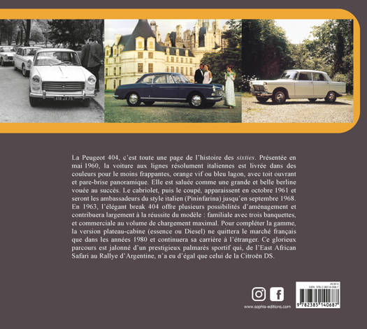 La Peugeot 404, c'est toute une page de l'histoire des sixties. Présenté en mai 1960, la voiture aux lignes résolument italiennes est livrée dans des couleurs pour le moins frappantes, orange vif ou bleu lagon, avec toit ouvrant et pare-brise panoramique. Elle est saluée comme une grande et belle berline vouée au succès. Le cabriolet, puis le coupé, apparaissent en octobre 1961 et seront les ambassadeurs du style italien (Pininfarina) jusqu'en septembre 1968. En 1963, l'élégant break 404 offre plusieurs possibilités d'aménagement et contribuera largement à la réussite du modèle : familiale avec trois banquettes, et commerciale au volume de chargement maximal. Pour compléter la gamme, la version plateau-cabine (essence ou Diesel) ne quittera le marché français que dans les années 1980 et continuera sa carrière à l'étranger. Ce glorieux parcours est jalonné d'un prestigieux palmarès sportif qui, de l'East African Safari au rallye d'Argentine, n'a eu d'égal que celui de la Citroën DS.