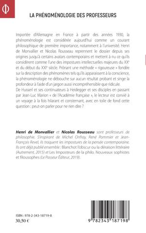 Importée d'Allemagne à partir des années 1930, la phénoménologie est considérée aujourd'hui comme un courant philosophique de première importance. Cet ouvrage reprend le dossier depuis ses origines jusqu'à certains avatars contemporains, et met à nu l'une des impostures intellectuelles majeures des XXe et XXIe siècles. Prônant une méthode « rigoureuse » fondée sur la description des phénomènes tels qu'ils apparaissent à la conscience, la phénoménologie ne débouche sur aucun résultat probant et singe la profondeur à l'aide d'un jargon aussi incompréhensible que ridicule. De Husserl à Heidegger et ses disciples en passant par Jean-Luc Marion, le lecteur est convié à un voyage à la fois hilarant et consternant, avec en toile de fond cette question : peut-on parler pour ne rien dire ?