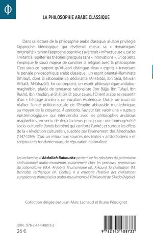 Dans sa lecture de la philosophie arabe classique, al-Jabri privilégie l'approche idéologique qui révélerait mieux sa « dynamique/originalité » ; sinon l'approche cognitive s'avérerait « infructueuse », car se limitant à répéter les théories grecques sans « innovations ». En ce sens, s'explique le souci majeur de concilier la religion avec la philosophie. C'est sous ce rapport qu'Al-Jabri distingue deux « esprits » traversant la pensée philosophique arabe classique : un esprit oriental-illuministe (Ishrâqî), dont la rationalité ira déclinante (Al-Fârâbî, Ibn Sînâ, Ikhwân Al-Safâ, Al-Ghazâlî). En contrepoint, un esprit philosophique andalou-maghrébin, plutôt de tendance rationaliste (Ibn Bâjja, Ibn Tufayl, Ibn Rushd, Ibn Khadûn, al-Shâtibî). Et pour cause, l'Orient arabe se ressentit d'un « héritage ancien », de vocation ésotérique. Outre, un souci de réaliser l'unité politico-sociale de l'Empire abbasside multiethnique, au moyen de la croyance. À contrario, l'auteur fait valoir une « rupture épistémologique » qui interviendra avec les philosophes andalous maghrébins, en vertu de deux facteurs principaux : une homogénéité socio-culturelle (fonds berbère) qui conforta l'unité ; et surtout les effets de la « révolution culturelle », suscitée par l'avènement des Almohades (1147-1269). D'où un retour aux sources des textes « aristotéliciens » et scripturaires fondamentaux, de réputation rationaliste.