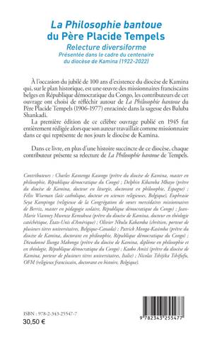 À l’occasion du jubilé de 100 ans d’existence du diocèse de Kaminaqui, sur le plan historique, est une oeuvre des missionnaires franciscains belges en République démocratique du Congo, les contributeurs de cet ouvrage ont choisi de réfléchir autour de La Philosophie bantoue du Père Placide Tempels (1906-1977) enracinée dans la sagesse des Baluba Shankadi. La première édition de ce célèbre ouvrage publié en 1945 fut entièrement rédigée alors que son auteur travaillait comme missionnaire dans ce qui représente de nos jours le diocèse de Kamina. Dans ce livre, en plus d’une histoire succincte de ce diocèse, chaque contributeur présente sa relecture de La Philosophie bantoue de Tempels.