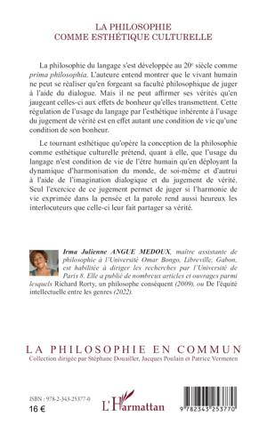 La philosophie du langage s’est développée au XXe siècle comme prima philosophia. L’auteure entend montrer que le vivant humain ne peut se réaliser qu’en forgeant sa faculté philosophique de juger à l’aide du dialogue. Mais il ne peut affirmer ses vérités qu’en jaugeant celles-ci aux effets de bonheur qu’elles transmettent. Cette régulation de l’usage du langage par l’esthétique inhérente à l’usage du jugement de vérité est en effet autant une condition de vie qu’une condition de son bonheur. Le tournant esthétique qu’opère la conception de la philosophie comme esthétique culturelle prétend, quant à elle, que l’usage du langage n’est condition de vie de l’être humain qu’en déployant la dynamique d’harmonisation du monde, de soi-même et d’autrui à l’aide de l’imagination dialogique et du jugement de vérité. Seul l’exercice de ce jugement permet de juger si l’harmonie de vie exprimée dans la pensée et la parole rend aussi heureux les interlocuteurs que celle-ci leur fait partager sa vérité.