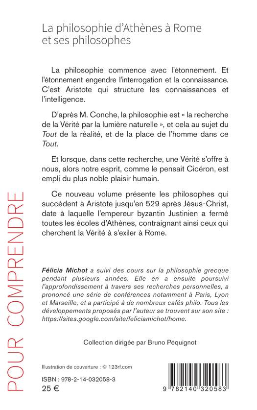 La philosophie commence avec l'étonnement. Et l'étonnement engendre l'interrogation et la connaissance. C'est Aristote qui structure les connaissances et l'intelligence. D'après M. Conche, la philosophie est « la recherche de la Vérité par la lumière naturelle », et cela au sujet du Tout de la réalité, et de la place de l'homme dans ce Tout. Et lorsque, dans cette recherche, une Vérité s'offre à nous, alors notre esprit, comme le pensait Cicéron, est empli du plus noble plaisir humain. Ce nouveau volume présente les philosophes qui succèdent à Aristote jusqu'en 529 après Jésus-Christ, date à laquelle l'empereur byzantin Justinien a fermé toutes les écoles d'Athènes, contraignant ainsi ceux qui cherchent la Vérité à s'exiler à Rome.