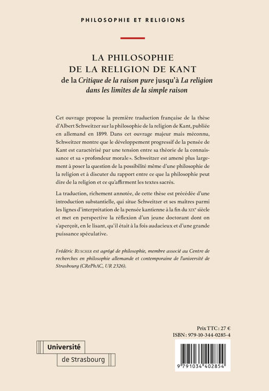 La traduction, richement annotée, de cette thèse est précédée d’une introduction substantielle, qui situe Schweitzer et ses maîtres parmi les lignes d’interprétation de la pensée kantienne à la fin du XIXe siècle et met en perspective la réflexion d’un jeune doctorant dont on s’aperçoit, en le lisant, qu’il était à la fois audacieux et d’une grande puissance spéculative.