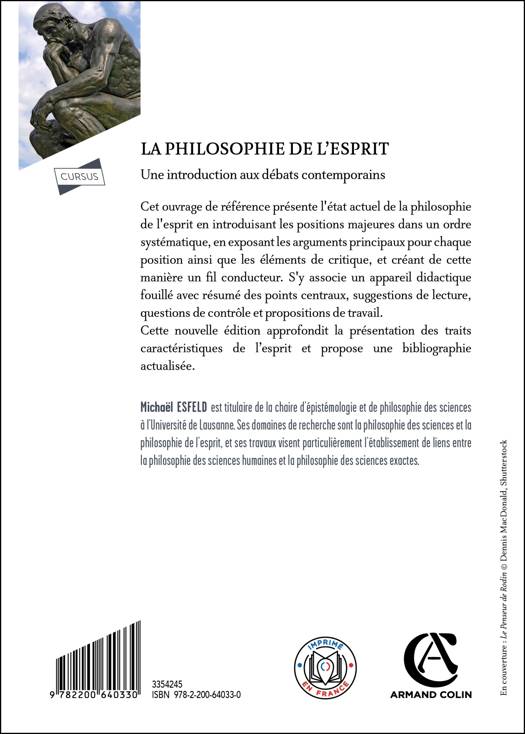 Cet ouvrage de référence présente l'état actuel de la philosophie de l'esprit en introduisant les positions majeures dans un ordre systématique, en exposant les arguments principaux pour chaque position ainsi que les éléments de critique, et créant de cette manière un fil conducteur. S'y associent un appareil didactique fouillé avec résumés des points centraux, suggestions de lecture, questions de contrôle et propositions de travail.