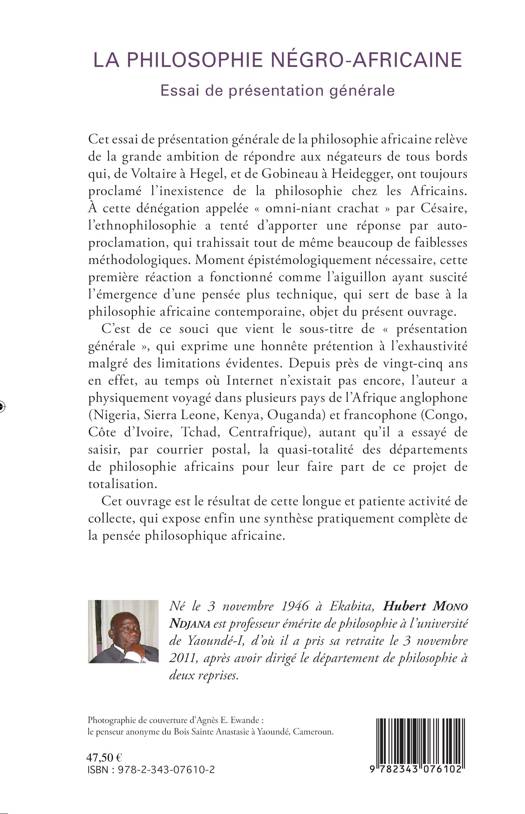 Cet essai de présentation générale de la philosophie africaine relève de la grande ambition de répondre aux négateurs de tous bords qui ont toujours proclamé l'inexistence de la philosophie chez les Africains. Depuis près de 25 ans, l'auteur a voyagé dans plusieurs pays de l'Afrique anglophone et francophone et effectué des recherches. Ce livre est le résultat de cette longue et patiente activité de collecte, qui expose une synthèse pratiquement complète de la pensée philosophique africaine.
