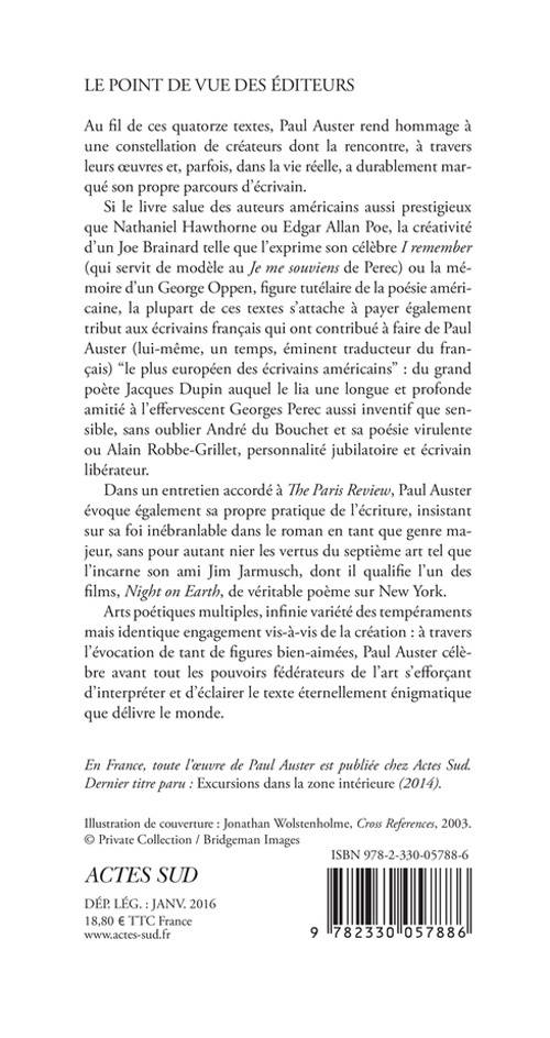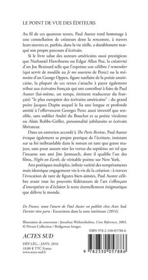Si le livre salue des auteurs américains aussi prestigieux que Nathaniel Hawthorne ou Edgar Allan Poe, la créativité d'un Joe Brainard telle que l'exprime son célèbre «I remember» (qui servit de modèle au «Je me souviens» de Perec) ou la mémoire d'un George Oppen, figure tutélaire de la poésie américaine, la plupart de ces textes s'attache à payer également tribut aux écrivains français qui ont contribué à faire de Paul Auster (lui-même, un temps, éminent traducteur du français) "le plus européen des écrivains américains" : du grand poète Jacques Dupin auquel le lia une longue et profonde amitié à l'effervescent Georges Perec aussi inventif que sensible, sans oublier André du Bouchet et sa poésie virulente ou Alain Robbe-Grillet, personnalité jubilatoire et écrivain libérateur.