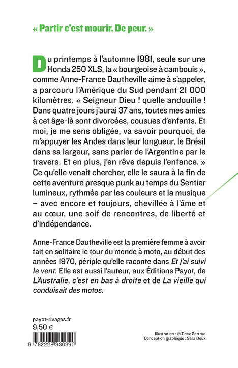 Du printemps à l'automne 1981, seule sur une Honda 250 XLS, la "bourgeoise à cambouis", comme Anne-France Dautheville aime à s'appeler, a parcouru l'Amérique du Sud pendant 21000 kilomètres. "Seigneur Dieu ! quelle andouille ! Dans quatre jours j'aurai 37 ans, toutes mes amies à cet âge-là sont divorcées, cousues d'enfants. Et moi, je me sens obligée, va savoir pourquoi, de m'appuyer les Andes dans leur longueur, le Brésil dans sa largeur, sans parler de l'Argentine par le travers. Et en plus, j'en rêve depuis l'enfance..." Ce qu'elle venait chercher là-bas, elle le saura à la fin de cette aventure presque punk au temps du Sentier lumineux, rythmée par les couleurs et la musique - avec encore et toujours, chevillée à l'âme et au coeur, une soif de rencontres, de liberté et d'indépendance.