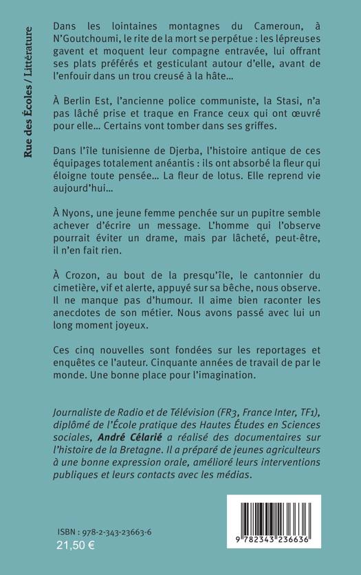 Dans les lointaines montagnes du Cameroun, à N'Goutchoumi, le rite de la mort se perpétue. À Berlin Est, l'ancienne police communiste, la Stasi, n'a pas lâché prise et traque en France ceux qui ont oeuvré pour elle... Certains vont tomber dans ses griffes. Dans l'île tunisienne de Djerba, l'histoire antique de ces équipages totalement anéantis: ils ont absorbé la fleur qui éloigne toute pensée... La fleur de lotus. Elle reprend vie aujourd'hui...À Nyons, une jeune femme penchée sur un pupitre semble achever d'écrire un message. L'homme qui l'observe pourrait éviter un drame, mais par lâcheté, peut-être, il n'en fait rien. À Crozon, au bout de la presqu'île, le cantonnier du cimetière, vif et alerte, appuyé sur sa bêche, nous observe. Il ne manque pas d'humour. Il aime bien raconter les anecdotes de son métier. Nous avons passé avec lui un long moment joyeux. Ces cinq nouvelles sont fondées sur les reportages et enquêtes ce l'auteur. Cinquante années de travail de par le monde. Une bonne place pour l'imagination.