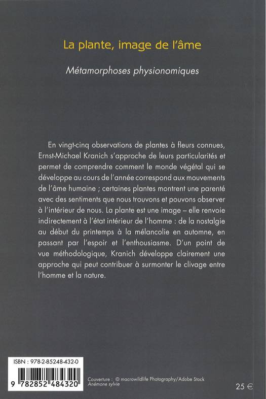 En vingt-cinq observations de plantes à fleurs connues, Ernst-Michael Kranich s'approche de leurs particularités et permet de comprendre comment le monde végétal qui se développe au cours de l’année correspond aux mouvements de l'âme humaine ; certaines plantes montrent une parenté avec des sentiments que nous trouvons et pouvons observer à l'intérieur de nous. La plante est une image - elle renvoie indirectement à l'état intérieur de l'homme : de la nostalgie au début du printemps à la mélancolie en automne, en passant par espoir et l'enthousiasme. D'un point de vue méthodologique, Kranich développe clairement une approche qui peut contribuer à surmonter le clivage entre l'homme et la nature. Cet ouvrage est anciennement paru sous le titre, "Métamorphoses physionomiques"