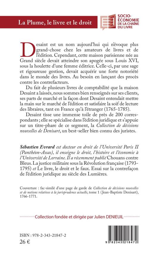 Desaint est un nom aujourd'hui qui n'évoque plus grand-chose chez les amateurs de livres et de l'édition. Cependant, cette maison parisienne née au Grand siècle devait atteindre son apogée sous Louis XVI, sous la houlette d'une femme éditrice. Celle-ci, par une sage et rigoureuse gestion, devait acquérir une forte notoriété dans le monde des livres. Au besoin en lançant des procès contre les contrefacteurs. Du fait de plusieurs livres de comptabilité que la maison Desaint a laissés, nous sommes bien renseignés sur ses clients, ses parts de marché et la façon dont Desaint entendait mettre la main sur le marché de l'édition et satisfaire la soif de lecture des libraires, tant en France qu'à l'étranger (1765-1785). Desaint tisse une immense toile de près de 200 correspondants; elle se spécialise dans l'édition juridique et s'appuie sur un titre-phare de ce segment, la Collection de décisions nouvelles de Denisart, un best-seller bien connu des juristes.