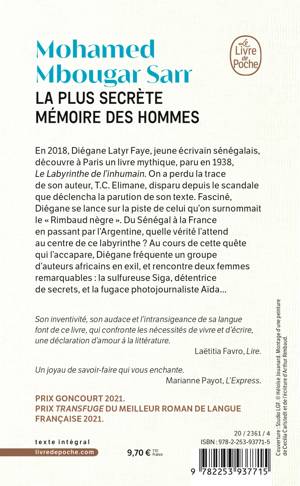 En 2018, Diégane Latyr Faye, jeune écrivain sénégalais, découvre à Paris un livre mythique, paru en 1938, Le Labyrinthe de l’inhumain. On a perdu la trace de son auteur, T.C. Elimane, disparu depuis le scandale que déclencha la parution de son texte. Fasciné, Diégane se lance sur la piste de celui qu’on surnommait le « Rimbaud nègre ». Du Sénégal à la France en passant par l'Argentine, quelle vérité l'attend au centre de ce labyrinthe ? Tout en menant cette quête qui l'accapare, Diégane, fréquente un groupe d’auteurs africains en exil, et rencontre deux femmes remarquables : la sulfureuse Siga, détentrice de secrets, et la fugace photojournaliste Aïda...