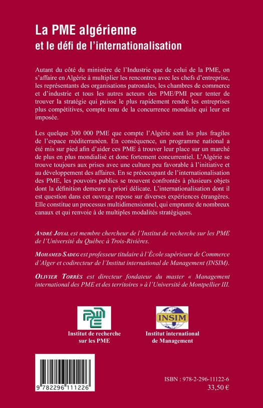 Les quelques 300 000 PME que compte l'Algérie sont les plus fragiles de l'espace méditerranéen. En conséquence, un programme national a été mis sur pied afin d'aider ces PME à trouver leur place sur un marché de plus en plus mondialisé et donc fortement concurrentiel. L'Algérie se trouve aux prises avec une culture peu favorable à l'initiative et au développement des affaires. En se préoccupant de l'internationalisation des PME, les pouvoirs publics se trouvent confrontés à de multiples questions.