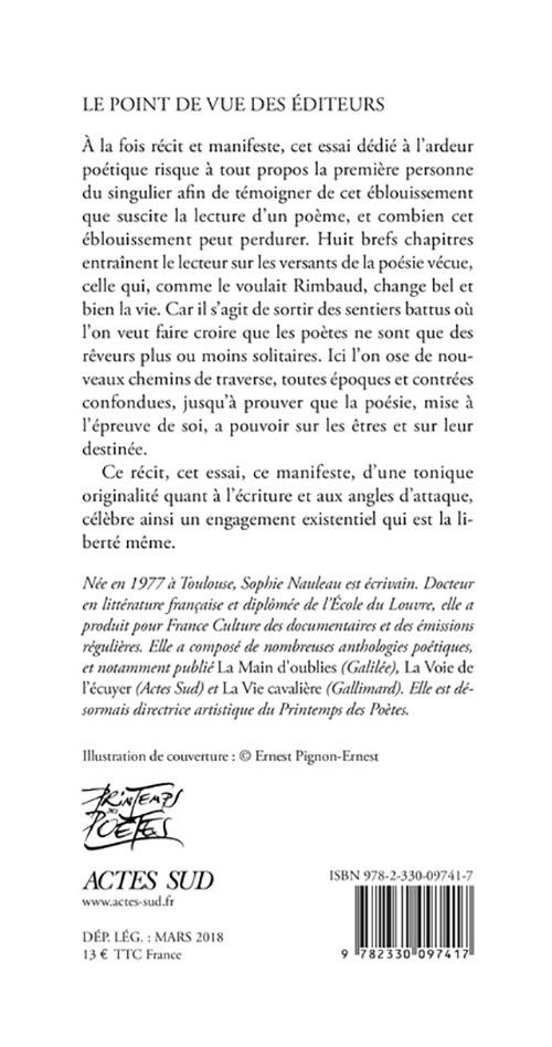 À la fois récit et manifeste, cet essai dédié à l'ardeur poétique risque à tout propos la première personne du singulier afin de témoigner de cet éblouissement que suscite la lecture d'un poème, et combien cet éblouissement peut perdurer. Huit brefs chapitres entraînent le lecteur sur les versants de la poésie vécue, celle qui, comme le voulait Rimbaud, change bel et bien la vie. Car il s'agit de sortir des sentiers battus où l'on veut faire croire que les poètes ne sont que des rêveurs plus ou moins solitaires. Ici l'on ose de nouveaux chemins de traverse, toutes époques et contrées confondues, jusqu'à prouver que la poésie, mise à l'épreuve de soi, a pouvoir sur les êtres et sur leur destinée.
