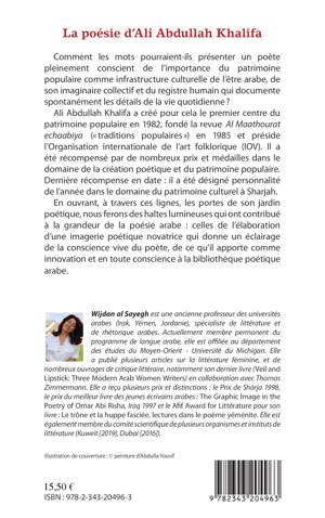 Comment les mots pourraient-ils présenter un poète pleinement conscient de l'importance du patrimoine populaire comme infrastructure culturelle de l'être arabe, de son imaginaire collectif et du registre humain qui documente spontanément les détails de la vie quotidienne ? Ali Abdullah Khalifa a créé pour cela le premier centre du patrimoine populaire en 1982, fondé la revue Al Maathourat echaabiya (« traditions populaires ») en 1985 et préside l'Organisation internationale de l'art folklorique (IOV). En ouvrant, à travers ces lignes, les portes de son jardin poétique, nous ferons des haltes lumineuses qui ont contribué à la grandeur de la poésie arabe : celles de l'élaboration d'une imagerie poétique novatrice qui donne un éclairage de la conscience vive du poète, de ce qu'il apporte comme innovation et en toute conscience à la bibliothèque poétique arabe.