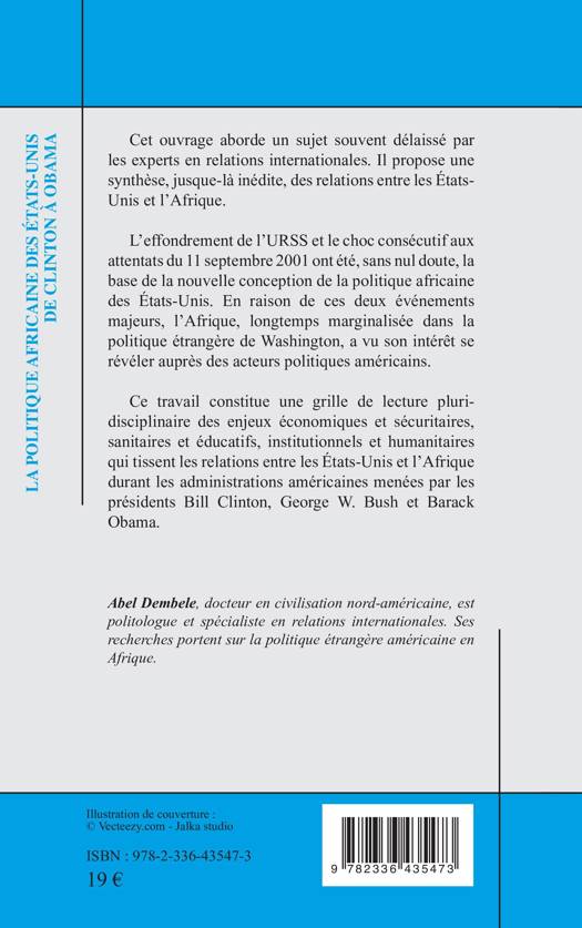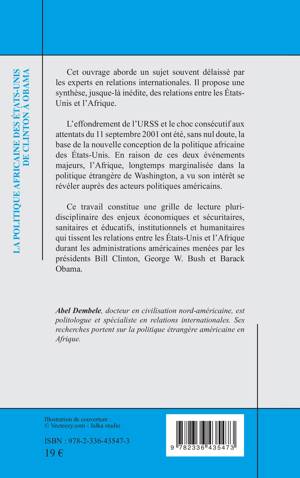 Ce travail constitue une grille de lecture pluri-disciplinaire des enjeux économiques et sécuritaires, sanitaires et éducatifs, institutionnels et humanitaires qui tissent les relations entre les États-Unis et l’Afrique durant les administrations américaines menées par les présidents Bill Clinton, George W. Bush et Barack Obama.